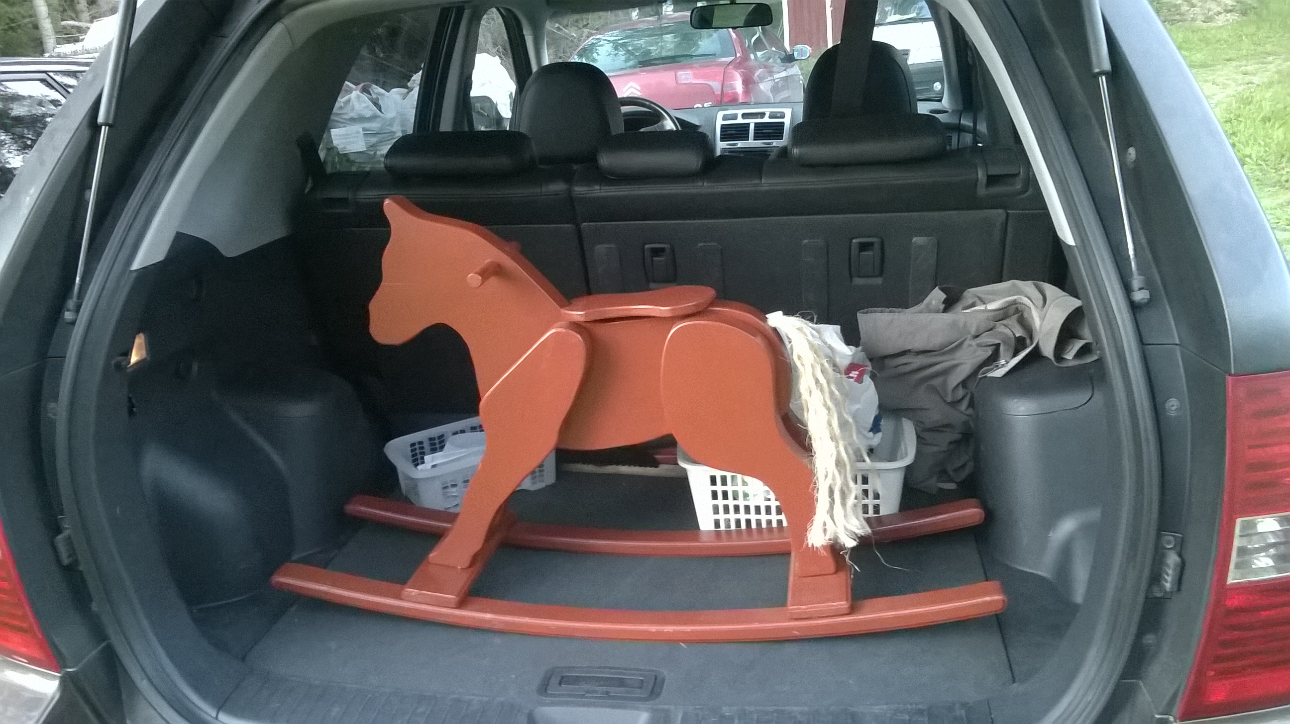 Erään auton perässä oli näkyvillä hieno keinuhevonen. Keinun tekijäksi ilmoittautui kesäkuhmalahtelainen Asko Mäkinen. Asko tekee näitä tilauksesta lisääkin. Katso kotisivut http://askonpuutyo.fi/asko/